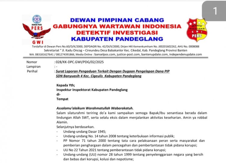 Dengan ini kami DPC GWI Pandeglang akan melaporakan Mantan Kepala SDN Banyuasih 4, Kepala SDN Banyuasih 4, dan Bendahara PIP SDN Banyuasih 4, kepada Inspektorat Pandeglang, agar di periksa dan di tindak lanjuti ke APH. (Ira/Red)