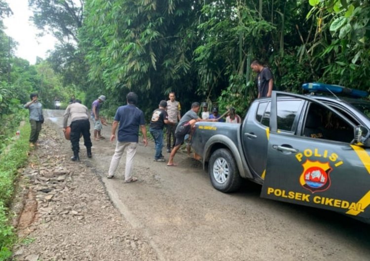 Melihat kondisi tersebut, sejumlah anggota kepolisian dari Polsek Cikedal bersama warga sekitar akhirnya berinisiatif memperbaiki jalan secara gotong royong.