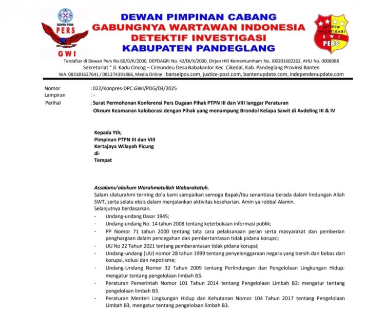 Banyak Pelanggaran Di PTPN III dan VIII Picung, DPC GWI Pandeglang Layangkan Surat Konferensi Pers