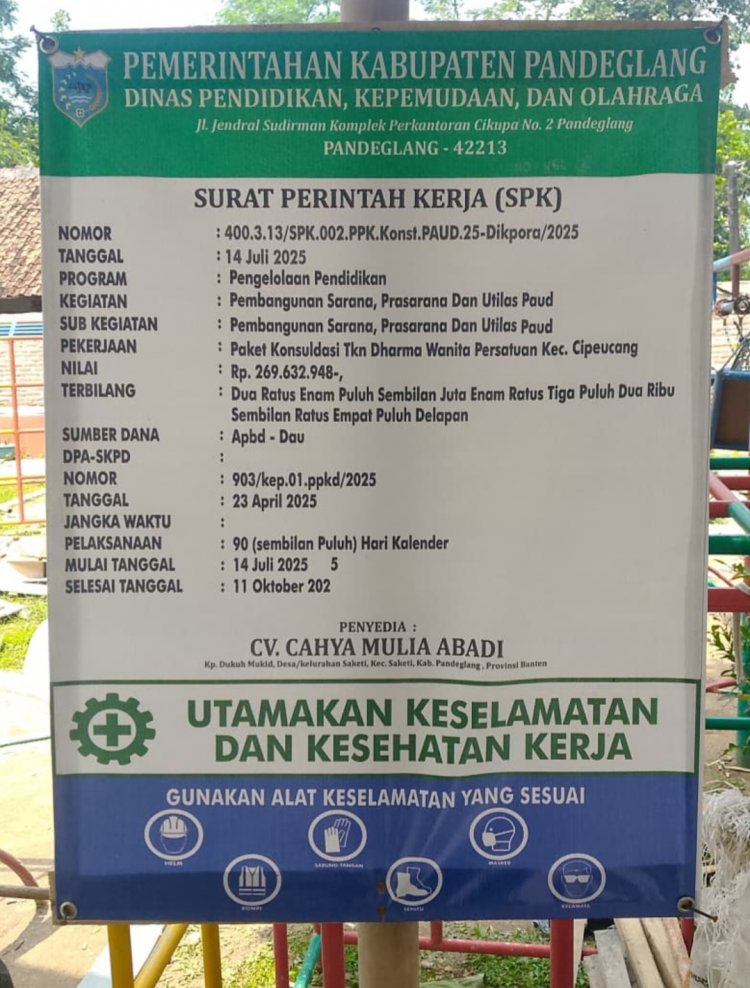 Proyek yang dikerjakan oleh CV. Cahaya Mulia Abadi ini memiliki nilai kontrak sebesar Rp. 269.632.948, bersumber dari APBD – DAU Tahun Anggaran 2025, dan merupakan bagian dari program Dinas Pendidikan dan Kepemudaan Olahraga (Disdikpora) Kabupaten Pandeglang untuk peningkatan infrastruktur pendidikan.