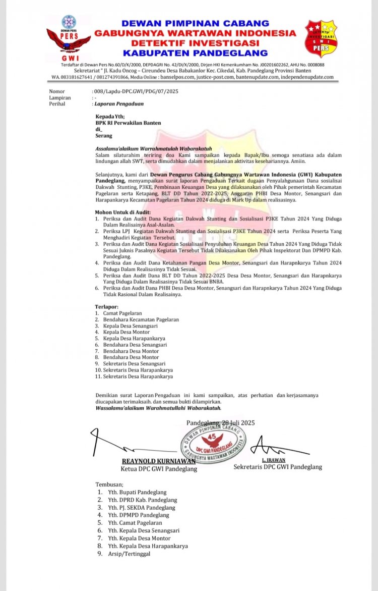 Banselpos.com, Pandeglang, Banten | Dewan Pengurus Cabang Gabungnya Wartawan Indonesia (GWI) Kabupaten Pandeglang menyoal terkait Beredar informasi di Desa Senangsari, Montor dan Harapankarya Kecamatan Pagelaran Kabupaten Pandeglang Provinsi Banten bahwa di tiga Desa tersebut diduga belum menyalurkan dana Bantuan Langsung Tunai (BLT) Dana Desa Tahap Dua Triwulan April, Mei, Juni Tahun 2025 untuk keluarga penerima manfaat (KPM) dan Dugaan Manipulasi Realisasi Dana Desa Tahun 2020 sampai 2025.