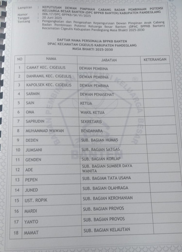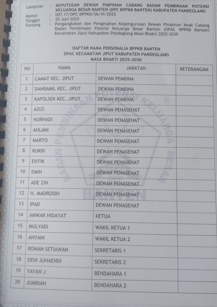 Banselpos.com, Pandeglang, Banten | Dewan Pimpinan Cabang (DPC) Badan Pembina Potensi Keluarga Banten (BPPKB) Kabupaten Pandeglang kembali menyegarkan dan meregenerasi jajaran DPAC (Dewan Pengurus Anak Cabang) tingkat Kecamatan.