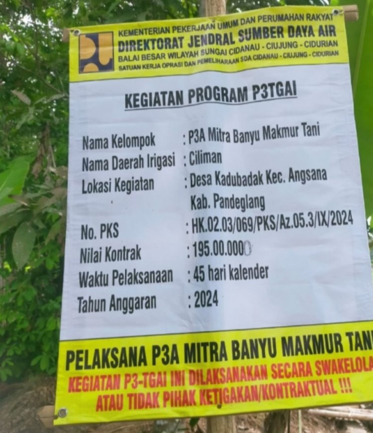 Banselpos.com Pandeglang, Banten | Pemerintah Kabupaten Pandeglang Provinsi Banten sedang gencar-gencarnya melakukan pembangunan insfratruktur dari berbagai bidang aspek yang sumber dananya dari APBD tapi parahnya kelompok P3A Mitra Banyu Makmur Tani Desa Kadubadak Kecamatan Angsana Kabupaten Pandeglang provinsi Banten, Yang saat ini sedang Melakukan pekerjaan pembangunan P3-TGAI Drainase Irigasi dengan titik lokasi Didesa Kadubadak, dengan nilai Anggaran Rp. 195.000.000,- (Seratus Sembilan Puluh Lima Juta Rupiah), No.PKS.HK.02.03/069/PKS/Az.05.3/IX/2024. Diduga tak sesuai spek atau asal jadi.