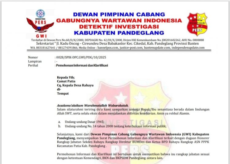 Banselpos.com, Pandeglang, Banten | Dewan Pengurus Cabang Gabungnya Wartawan Indonesia (GWI) Kabupaten Pandeglang menyoal Praktik perangkat desa dan ketua BPD yang merangkap jabatan di Desa Rahayu, Kecamatan Patia, Kabupaten Pandeglang, Banten, kembali menjadi sorotan. Hal ini dikhawatirkan dapat menghambat kinerja dan pelayanan publik kepada masyarakat.