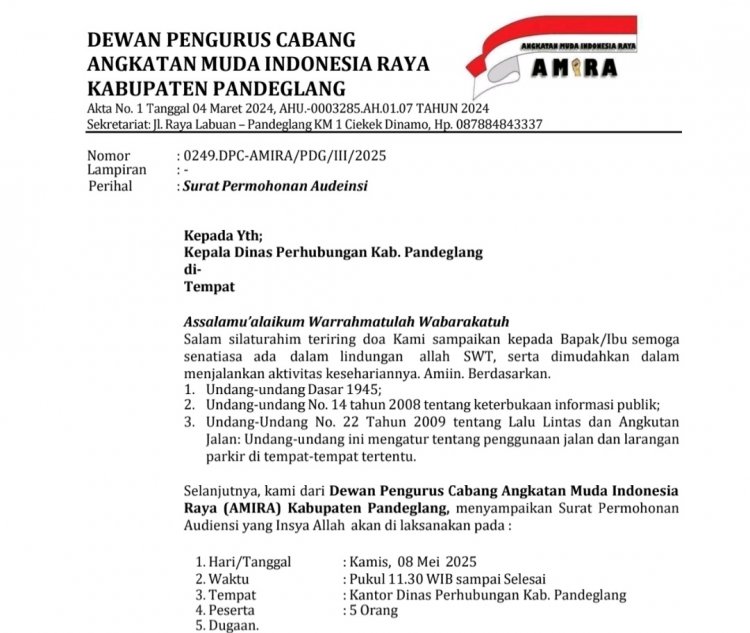 Banselpos.com, Pandeglang, Banten | Dewan Pengurus Cabang Angkatan Muda Indonesia Raya (AMIRA) Kabupaten Pandeglang menyoal adanya lahan parkir di bahu Jalan sepajang Pasar Labuan dan Pasar Panimbang, Pandeglang, Banten. Hal ini muncul karena kendaraan yang parkir menyebabkan kemacetan di jam-jam sibuk.